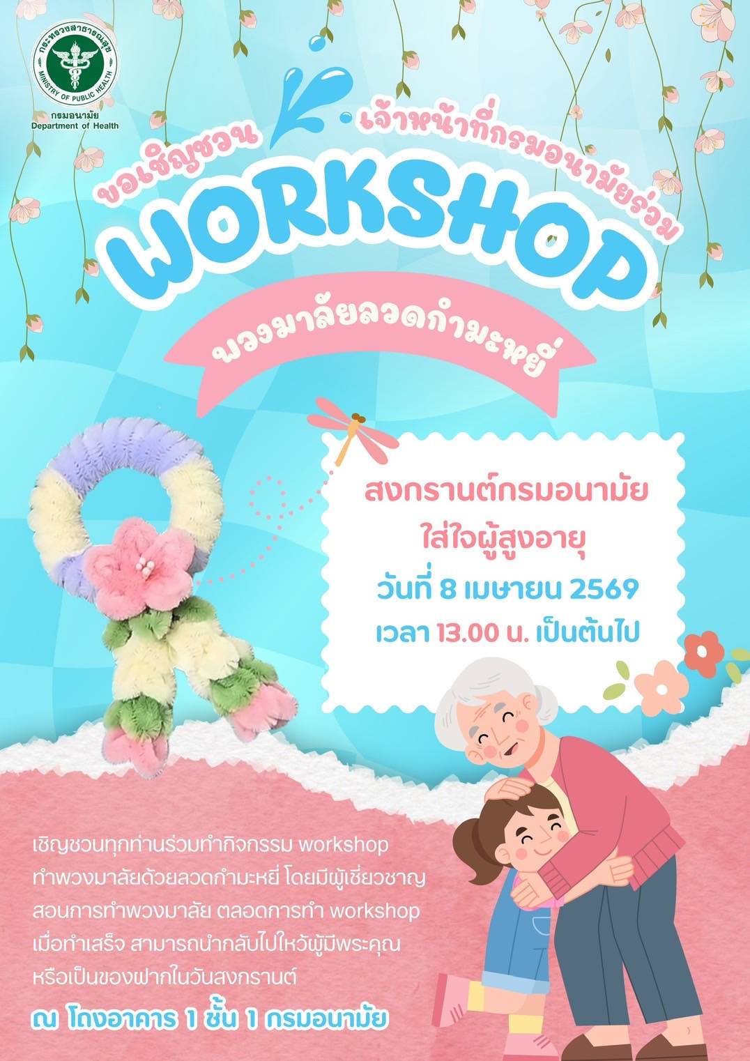 สำนักงานเลขานุการกรม ขอเชิญชวนทุกท่าน เข้าร่วมกิจกรรม workshop พวงมาลัยลวดกำมะหยี่ ในงาน“สงกรานต์กรมอนามัย ใส่ใจผู้สูงอายุ”วัน ที่ 8 เมษายน 2569 เวลา 13.00 น. เป็นต้นไป โดยมีผู้เชี่ยวชาญสอนการทำพวงมาลัย ตลอดการทำ workshop เมื่อทำเสร็จ สามารถนำกลับไปไหว้ผู้มีพระคุณหรือเป็นของฝากในวันสงกรานต์ ณ บริเวณโถงอาคาร1 ชั้น 1 กรมอนามัย