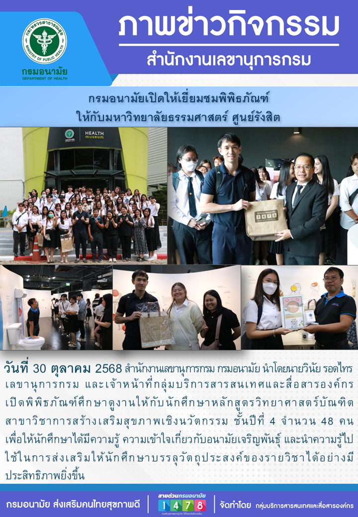 วันที่ 30 ตุลาคม 2568 สำนักงานเลขานุการกรม กรมอนามัย นำโดยนายวินัย รอดไทร เลขานุการกรม และเจ้าหน้าที่กลุ่มบริการสารสนเทศและสื่อสารองค์กร เปิดพิพิธภัณฑ์ศึกษาดูงานให้กับนักศึกษาหลักสูตรวิทยาศาสตร์บัณฑิต สาขาวิชาการสร้างเสริมสุขภาพเชิงนวัตกรรม ชั้นปีที่ 4 จำนวน 48 คน เพื่อให้นักศึกษาได้มีความรู้ ความเข้าใจเกี่ยวกับอนามัยเจริญพันธุ์ และนำความรู้ไปใช้ในการส่งเสริมให้นักศึกษาบรรลุวัตถุประสงค์ของรายวิชาได้อย่างมีประสิทธิภาพยิ่งขึ้น