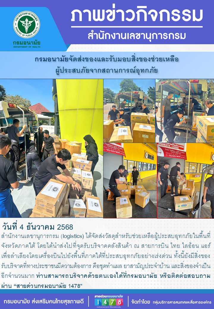 วันที่ 4 ธันวาคม 2568 สำนักงานเลขานุการกรม (logistics) ได้จัดส่งวัสดุสำหรับช่วยเหลือผู้ประสบอุทกภัยในพื้นที่จังหวัดภาคใต้ โดยได้นำส่งไปที่จุดรับบริจาคคลังสินค้า ณ สายการบิน ไทย ไลอ้อน แอร์ เพื่อลำเลียงโดยเครื่องบินไปยังพื้นที่ภาคใต้ที่ประสบอุทกภัยอย่างเร่งด่วน ทั้งนี้ยังมีสิ่งของรับบริจาคที่ทางประชาชนมีความต้องการ คือชุดทำแผล ยาสามัญประจำบ้าน และสิ่งของจำเป็นอีกจำนวนมาก