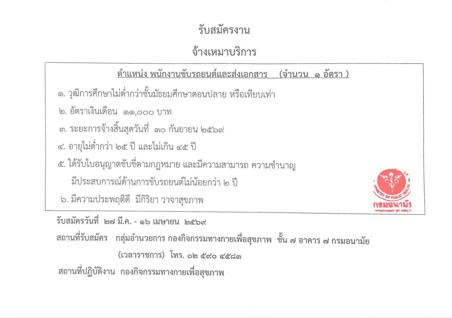 | กองกิจกรรมทางกายเพื่อสุขภาพ ประกาศ รับสมัครงาน ตำแหน่ง พนักงานขับรถยนต์และส่งเอกสาร จำนวน 1 อัตรา ตั้งแต่บัดนี้ – 16 เมษายน 2569 .pdf |